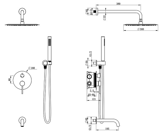 - Состав комплекта: верхний душ, душевой гарнитур, излив, смеситель для ванны с душем, настенный держатель.