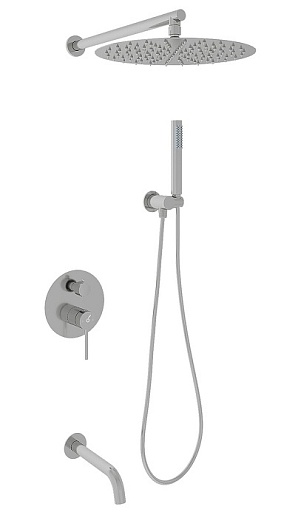 - Состав комплекта: верхний душ, душевой гарнитур, излив, смеситель для ванны с душем, настенный держатель.