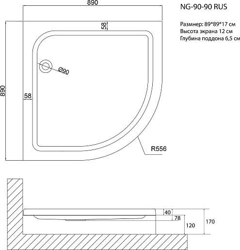 - Размер (ШхГхВ): 900х900х170 мм.
