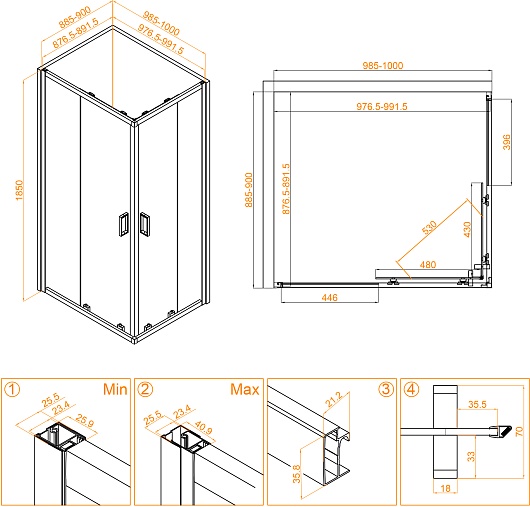 - Размеры с диапазоном регулировок (ШxГ): 885-900 x 985-1000 мм.