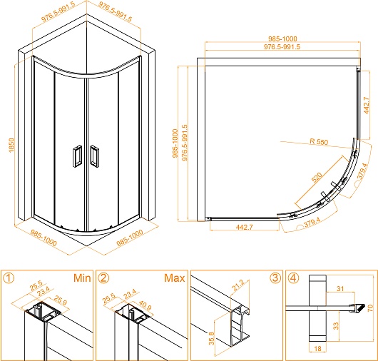 - Размеры с диапазоном регулировок (ШxГ): 985-1000 x 985-1000 мм.