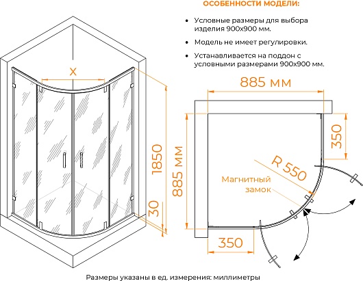- Размеры с диапазоном регулировок (ШxГ): 885 x 885 мм.