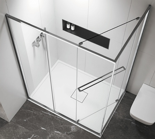 - Конструкция со сдвижными дверями на прочном алюминиевом профиле цвета матовый графит обеспечивает плавное и бесшумное движение, экономя пространство.