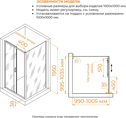 - Размеры с диапазоном регулировок (ШxГ): 995-1035 x 990-1005 мм.