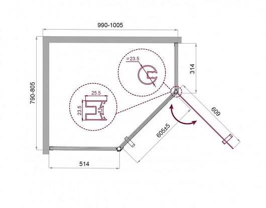 - Стекло 5 мм в двери, 4 мм в неподвижных стенках. C (прозрачное).
