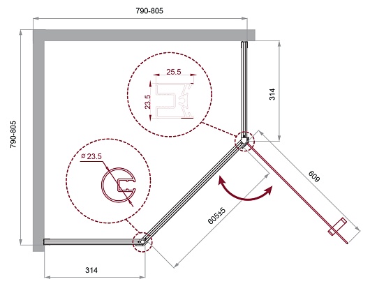 - Стекло 5 мм в двери, 4 мм в неподвижных стенках.