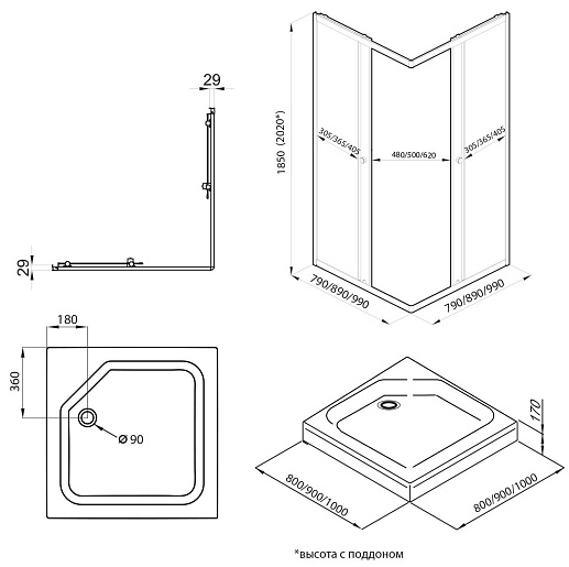 - Монтаж-пристенный в угол/на поддон/на пол.