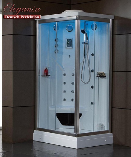 Функции: пар, ароматерапия, радио FM, сенсорный пульт, вентилятор, верхний свет, душевая лейка на штанге, ручной душ, восемь форсунок, две стеклянных полки.