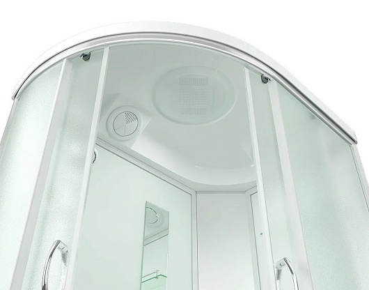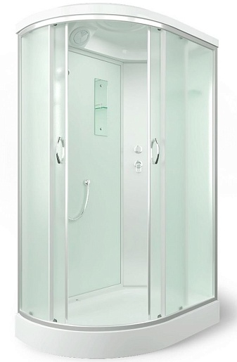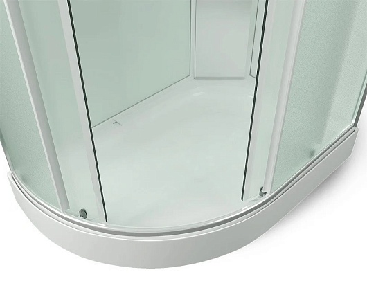Задняя стенка душевой исполнена из стекла белого цвета, стёкла двух раздвижных дверец – матовые.особенности: