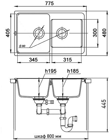 - Размеры чаш: 345х405х195 мм, 315х300х185 мм.