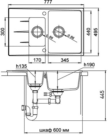 - Размеры чаш: 345х440х190 мм, 170х300х135 мм.