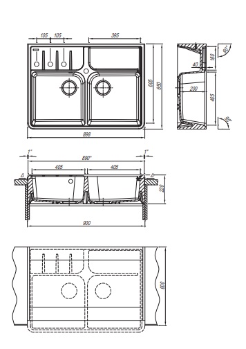 - комплектация: отводная арматура для двух одноуровневых чаш с выпусками 3,5 дюйма (D=90 мм) и переливом.