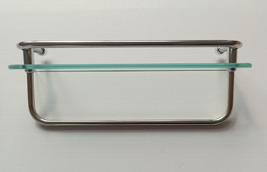 - Стеклянная полочка с ограничителем и вешалкой для банных аксессуаров.