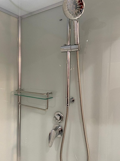 - Стеклянная полочка с ограничителем и вешалкой для банных аксессуаров.