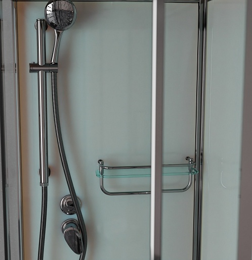 - Стеклянная полочка с ограничителем и вешалкой для банных аксессуаров.