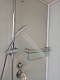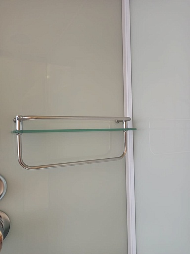 - Стеклянная полочка с ограничителем и вешалкой для банных аксессуаров.
