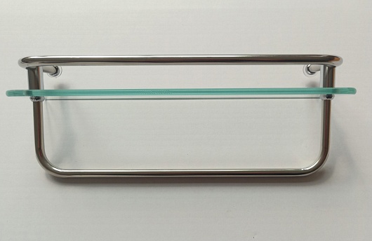 - Стеклянная полочка с ограничителем и вешалкой для банных аксессуаров .