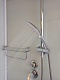 - Стеклянная полочка с ограничителем и вешалкой для банных аксессуаров.