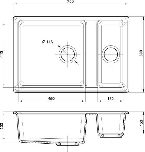 - Размеры чаш: 450x440x200, 180x440x150 мм.