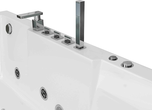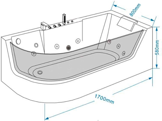 Комплектация: ванна, каркас, смеситель с душевой лейкой, система гидромассажа, подголовник, сифон.
