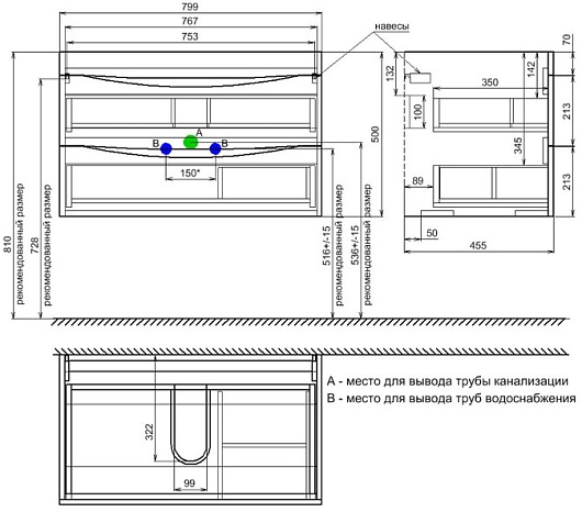 - В верхнем ящике расположен ограничитель под сифон, в нижнем ящике - органайзер.
