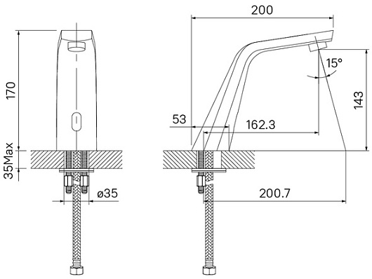 Комплектация: смеситель, электрический блок питания, гибкая подводка, соединительный провод 500 мм.