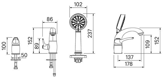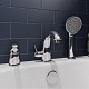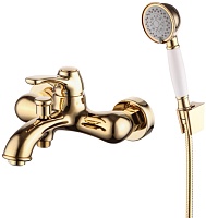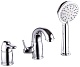 Комплектация: смеситель, гибкая подводка, душевая лейка, шланг, держатель лейки.