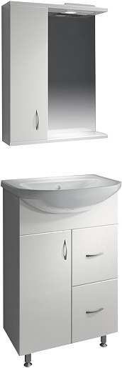 Комплектация: Зеркальное полотно с нижней полкой и козырьком с встроенным галогеновым светильником и выключателем. Слева распашной ящик с внутренней полкой.