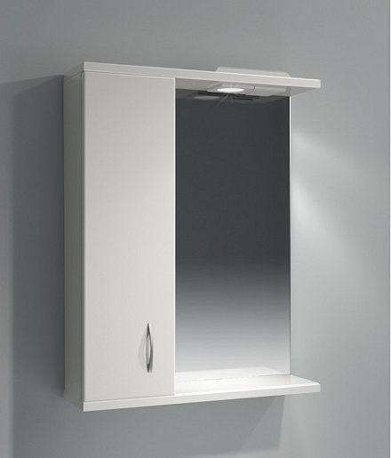 Комплектация: Зеркальное полотно с нижней полкой и козырьком с встроенным галогеновым светильником и выключателем. Слева распашной ящик с внутренней полкой.
