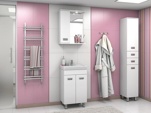 Комплектация: зеркальное полотно с нижней полкой, козырьком с галогеновым светильником и выключателем. Справа расположен распашной шкаф с вкладными полками и хромированной металлической врезной ручкой.