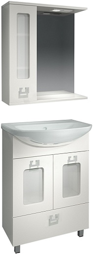 Комплектация: Зеркальное полотно с нижней полкой и козырьком с встроенным галогеновым светильником и выключателем. Слева распашной ящик с внутренними полками.