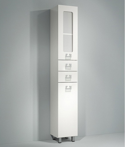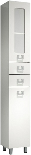 Описание: напольный пенал для ванной на ножках с двумя распашными дверцами и двумя выдвижными ящики. Металлические хромированные ручки и ножки.