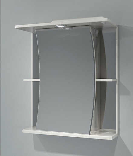 Комплектация: Распашной шкаф с зеркальным фасадом и внутренними полками. Слева и справа полки. Козырек с встроенным галогеновым светильником и выключателем.
