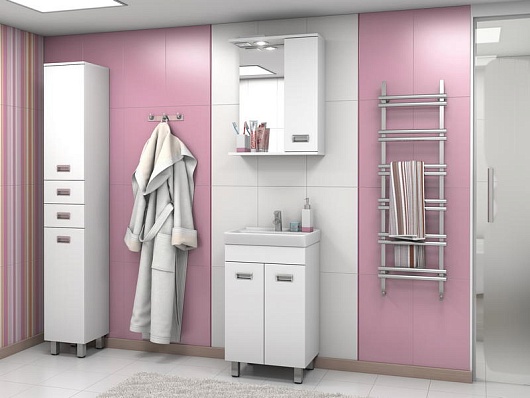 Комплектация: зеркальное полотно с нижней полкой, козырьком с галогеновым светильником и выключателем. Справа расположен распашной шкаф с вкладными полками и хромированной металлической врезной ручкой.