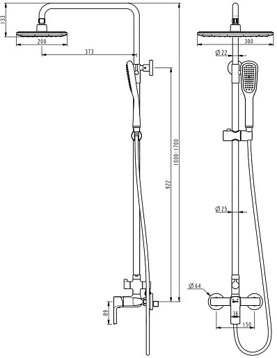 Комплектация: смеситель, шланг, душевая лейка, держатель лейки, верхний душ, штанга.