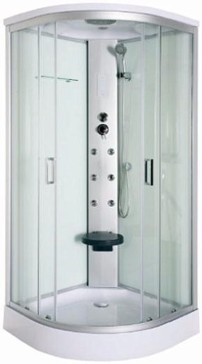 - Комплектация: полки, откидное сидение, держатель для ручного душа (поворотный 3 положения), сифон, трехрежимная душевая лейка (Ø89мм)