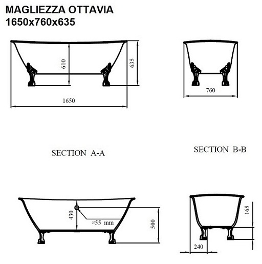 Magliezza Акриловая ванна на лапах Ottavia (165х76) ножки бронза