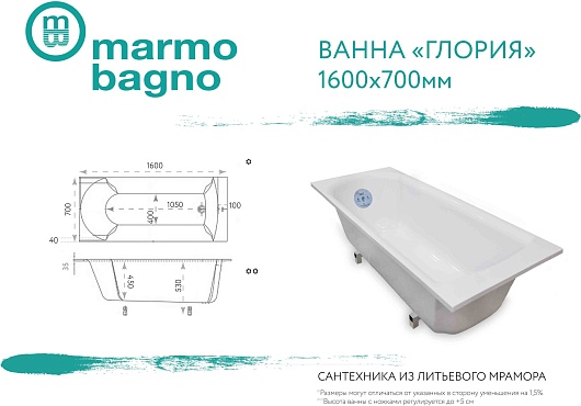 Ванна из литьевого мрамора Marmo Bagno Глория 160x70 - арт. MB-GL160-70.