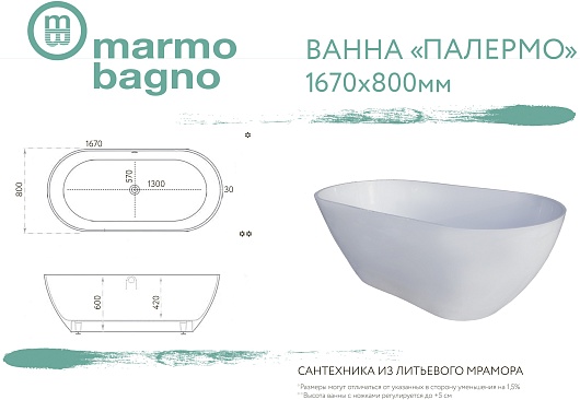 Ванна из литьевого мрамора Marmo Bagno Палермо 168х80 - арт. MB-PL170-80.