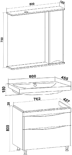 В комплекте: тумба, раковина, зеркальный шкаф, ножка (4 шт.).