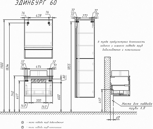 В комплекте: тумба, столешница, раковина, зеркальный шкаф, крепеж.