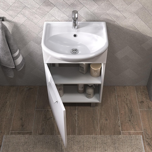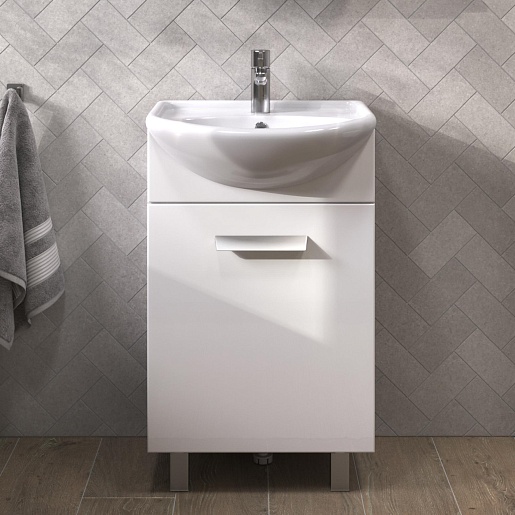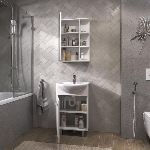 В комплекте: тумба, раковина, зеркальный шкаф, крепеж, ножка (3 шт.).