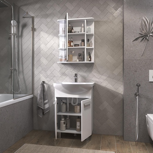 В комплекте: тумба, раковина, зеркальный шкаф, крепеж, ножка (3 шт.).