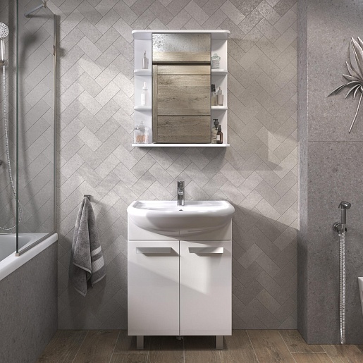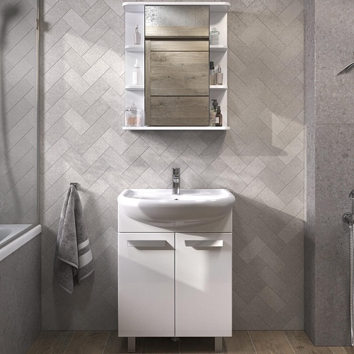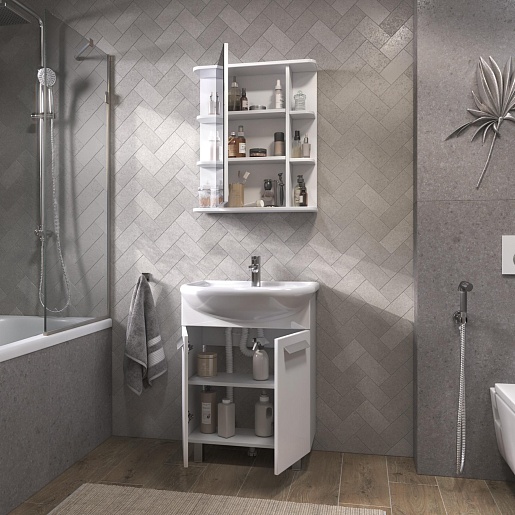 В комплекте: тумба, раковина, зеркальный шкаф, крепеж, ножка (3 шт.).