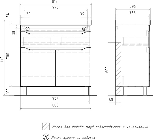 - 2 распашные дверцы, 1 выдвижной ящик.
