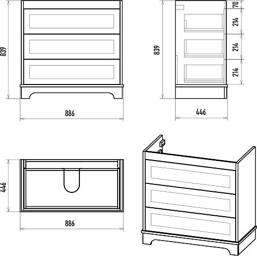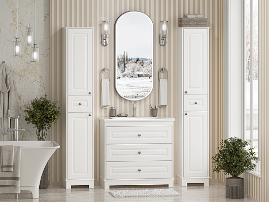 В комплекте: тумба, раковина, зеркало, крепеж, ножки.