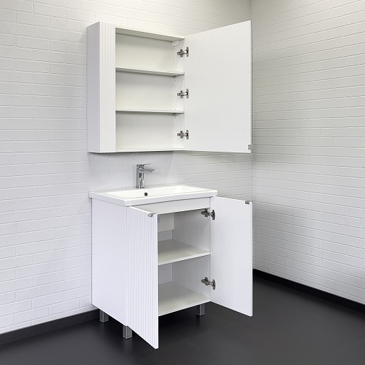 В комплекте: тумба, раковина, зеркальный шкаф, комплект ножек.