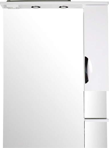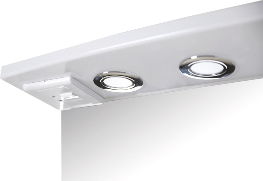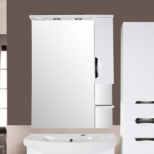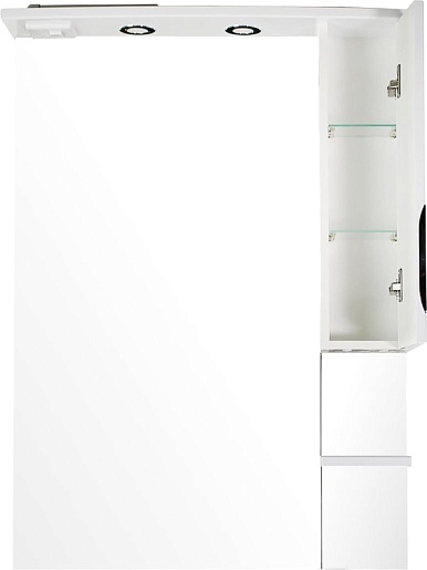 - Оснащение: влагостойкое зеркальное полотно, справа шкафчик с распашной дверцей с доводчиками, полочка, встроенные в карниз светильники, розетка и выключатель.