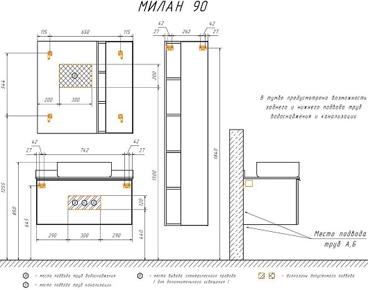 В комплекте: тумба, раковина, столешница, зеркальный шкаф, крепеж.