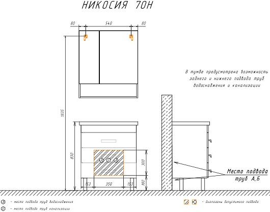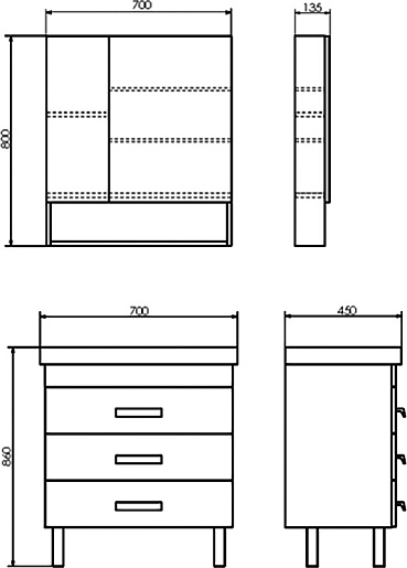 В комплекте: тумба, раковина, зеркальный шкаф, ножка (4 шт.).